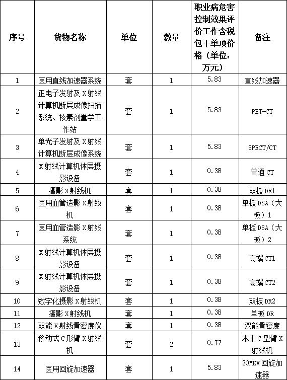 1.1.2服務內容: 綿陽三江醫(yī)院項目(一期)職業(yè)病危害控制效果評價工作全部工作內容:進行現(xiàn)場驗收檢測并編制職業(yè)病危害放射防護控制效果評價工作報告書,協(xié)調市衛(wèi)健部門召開職業(yè)病危害控制效果評價工作報告專家審核會議,通過專家評審,并最終取得批復。具體設備如下: