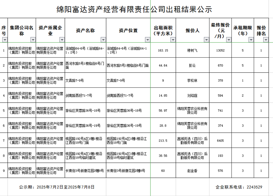 綿陽富達(dá)資產(chǎn)經(jīng)營有限責(zé)任公司出租結(jié)果公示