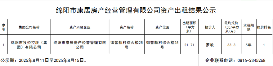 綿陽市康居房產(chǎn)經(jīng)營(yíng)管理有限公司資產(chǎn)出租結(jié)果公示