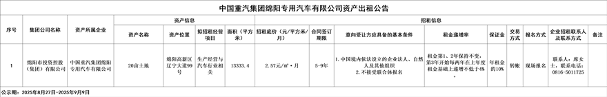 中國(guó)重汽集團(tuán)綿陽專用汽車有限公司資產(chǎn)出租公告