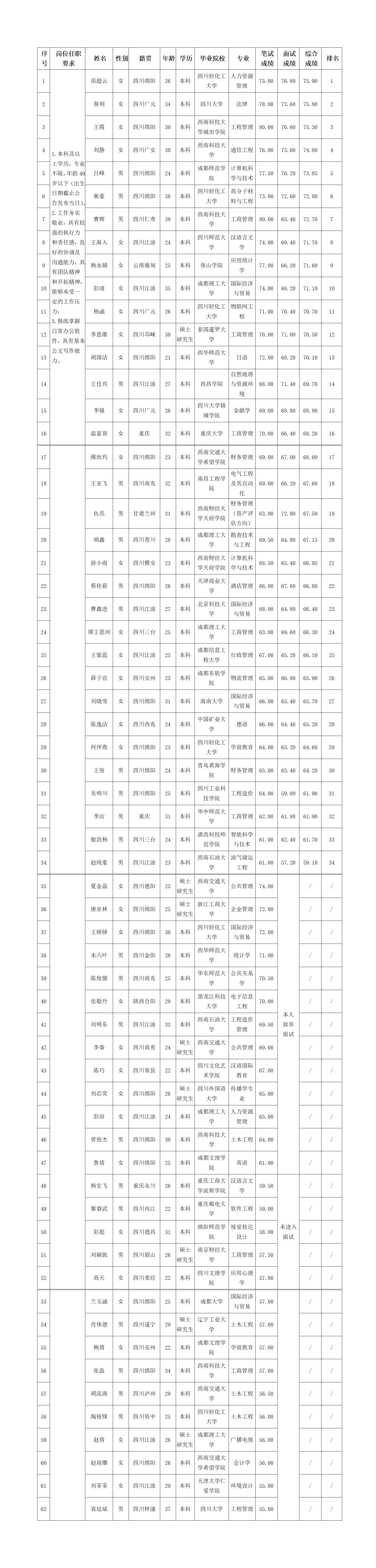 根據(jù)四川綿江能源有限公司發(fā)布的招聘公告及招聘相關(guān)規(guī)定,經(jīng)筆試、面試等程序,現(xiàn)將筆試、面試成績(jī)予以公示。