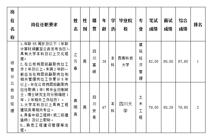根據(jù)四川嘉來建筑工程有限公司發(fā)布的延長(zhǎng)項(xiàng)目管理分公司總經(jīng)理崗位報(bào)名時(shí)間的公告及相關(guān)規(guī)定,經(jīng)筆試、面試等程序,現(xiàn)將綜合成績(jī)予以公示。