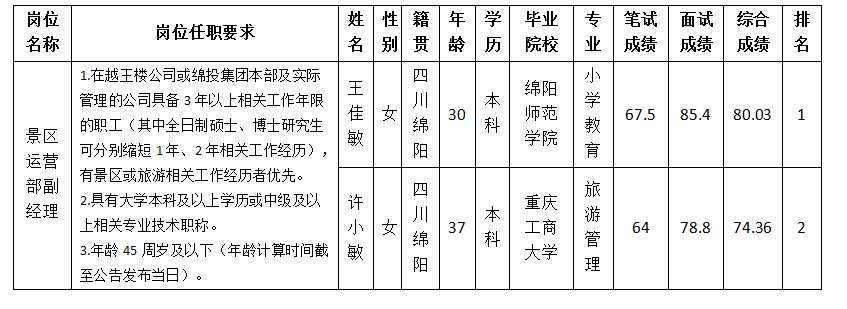 根據(jù)四川越王樓文化傳播有限公司發(fā)布的招聘公告及招聘相關(guān)規(guī)定,經(jīng)筆試、面試等程序,現(xiàn)將筆試(面試)成績予以公示。