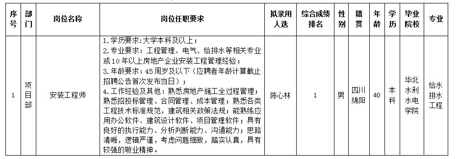 根據(jù)綿陽市綿投置地有限公司發(fā)布的招聘公告及招聘相關規(guī)定,經筆試、面試、考察、體檢等程序,擬錄用陳心林同志到綿陽市綿投置地有限公司工作,現(xiàn)予以公示,具體情況如下: