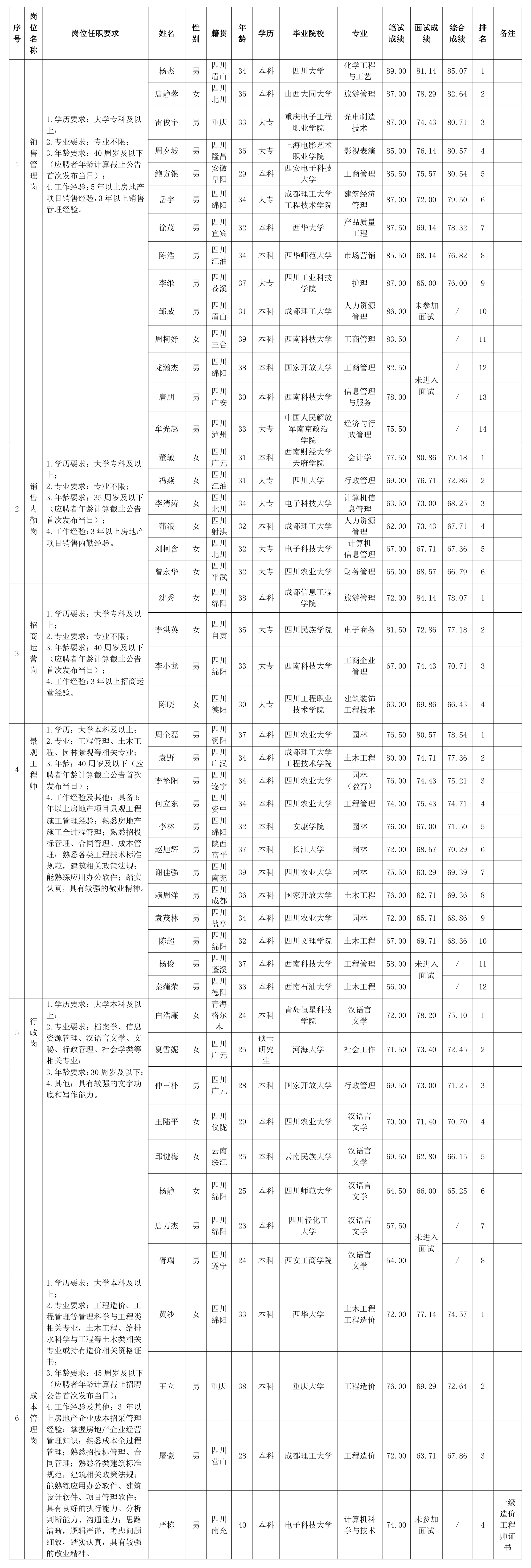 根據(jù)綿陽(yáng)市綿投置地有限公司發(fā)布的招聘公告及招聘相關(guān)規(guī)定,經(jīng)筆試、面試等程序,現(xiàn)將筆試、面試成績(jī)予以公示。