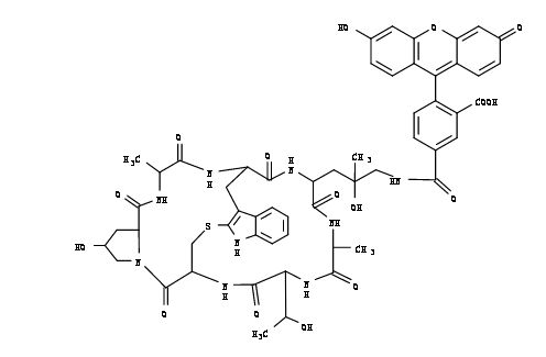 這種綠色熒光鬼筆環(huán)肽綴合物(相當(dāng)于FITC標(biāo)記的鬼筆環(huán)肽)會選擇性結(jié)合F-肌動蛋白。鬼筆環(huán)肽衍生物經(jīng)常以納摩爾濃度使用,常在甲醛固定和透化的組織切片、細(xì)胞培養(yǎng)或無細(xì)胞實驗中用于標(biāo)記、鑒定和定量F-肌動蛋白的便捷探針。